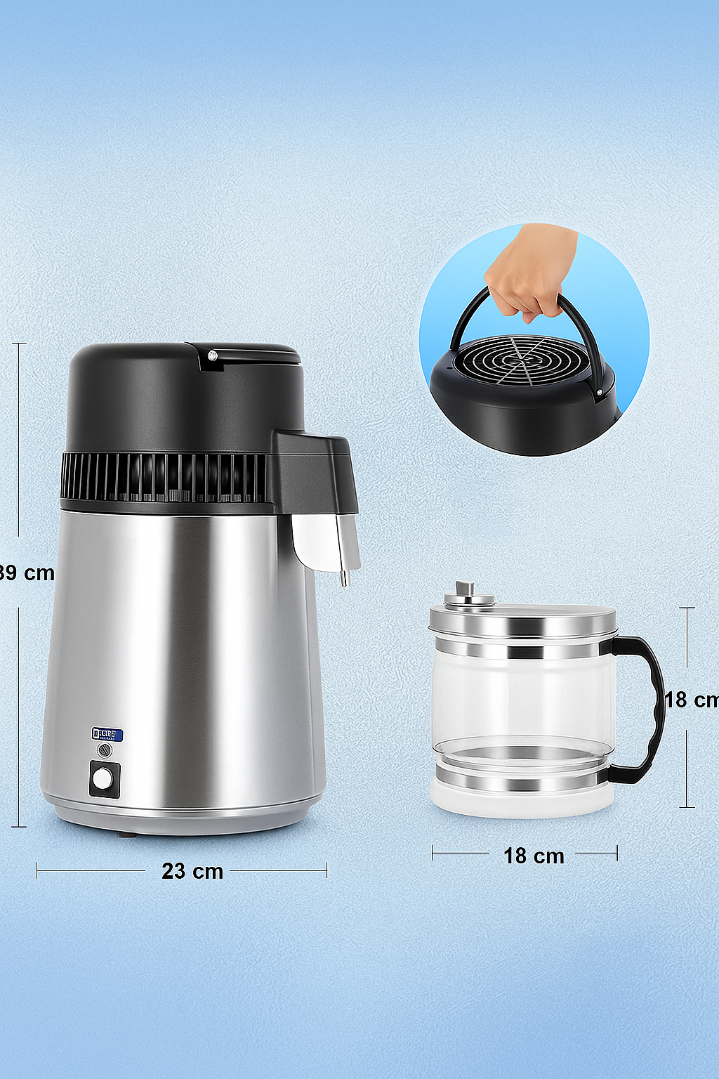 Destilador de Agua en Acero inoxidable con recipiente en vidrio tiene como función generar agua destilada que se usa en autoclaves, vaporizadores, humidificadores, máquinas de CPAP, baterías de plomo-ácido, sistemas de enfriamiento del motor, planchas de vapor, cascadas, acuarios de peces, etc. Produce 1.5 litros de agua destilada pura por hora. El contenedor interno y externo está hecho de acero inoxidable de alto grado. Procesa el agua a través del calentamiento, la evaporación y la condensación para separar el agua pura y fresca de los contaminantes. Cuenta con Certificado de ISO9001: 2000 / ISO 13485: 2003, CE y registrado en FDA de EE.UU. Fácil de operar, no requiere instalación. Elimina contaminantes como bacterias, partículas, sólidos disueltos y COV Elimina eficazmente la mayoría de las impurezas del agua del grifo. Voltaje: 110VAC 60Hz Potencia de salida: 750W Destilación X hora: 1.5L Volumen interno del envase: 4L Tubo de descarga de acero inoxidable: 316L Contenedor interno: acero inoxidable 304 Calentador. Recipiente en vidrio Electrónico: Aluminio Botella de agua: PC (246 °C) Contenedor interno: acero inoxidable 304 Protección automática: apagado cuando la temperatura es de 160 grados C Peso neto: 4 kg Tamaño: 290mm × 290mm × 390 mm Tamaño del paquete: 300mm × 300mm × 500mm