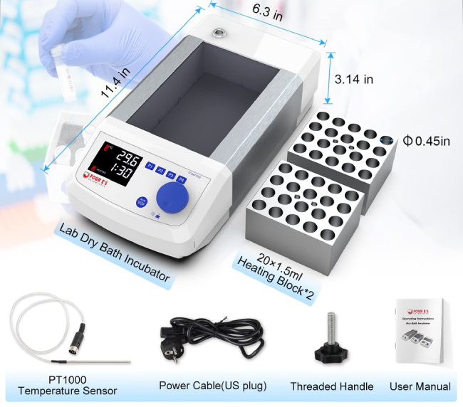 BLOQUE ESTÁNDAR INCLUIDO: Se incluyen 48  bloques calefactores de 1,5 ml. Es para tubos cónicos. El diámetro del orificio es Φ11,5 y la profundidad del orificio es 36,9 mm.