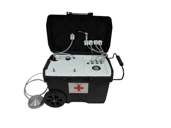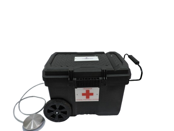 Interior del módulo: Compresor aire seco libre de aceite de 1 HP, pistón y anillos en teflón, regulador e indicador de presión, filtro de aire. Especificaciones compresor: 110-120 V – 50-60Hz- 750 W Nivel de ruido 69dB – Flujo de aire 72Ls X min. Tanque de agua de 1 litro. Pedal neumático en acero, maletín fabricado en polipropileno de alta duración, con ruedas grandes de uso rudo de 7 1/2" (22 cm) para facilitar la transportación y manija tipo Roller-bag.